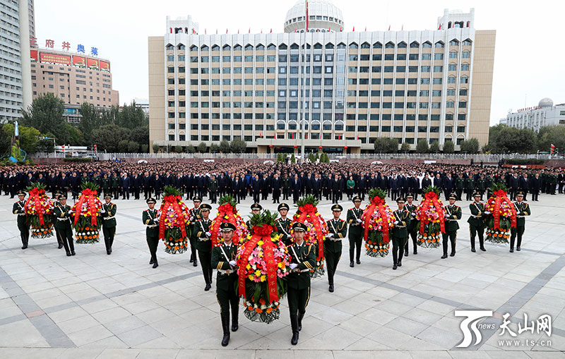 9月30日,自治区在乌鲁木齐人民广场隆重举行向人民英雄敬献花篮仪式。自治区领导与我区各族各界代表一起,向人民英雄敬献花篮,深切缅怀为新疆解放和建设事业建立不朽功勋的革命先烈。新疆日报记者崔志坚摄